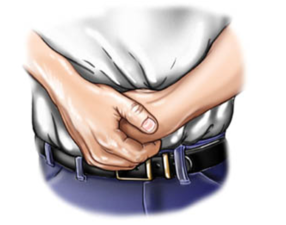 - Formi un puny amb la ma. Col·loqui el puny amb el costat del polze contra ventre de la persona, just avall del melic però molt per sota de l’estèrnum. Vegeu la imatge A.