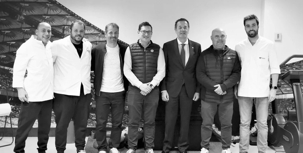 Oriol Camacho, consejero de la Mutualidad, Emilio Escotet, subdirector general, y José Miguel Calle, director general de la FCF, junto a parte del equipo de fisioterapeutas de la Mutualidad de Futbolistas.